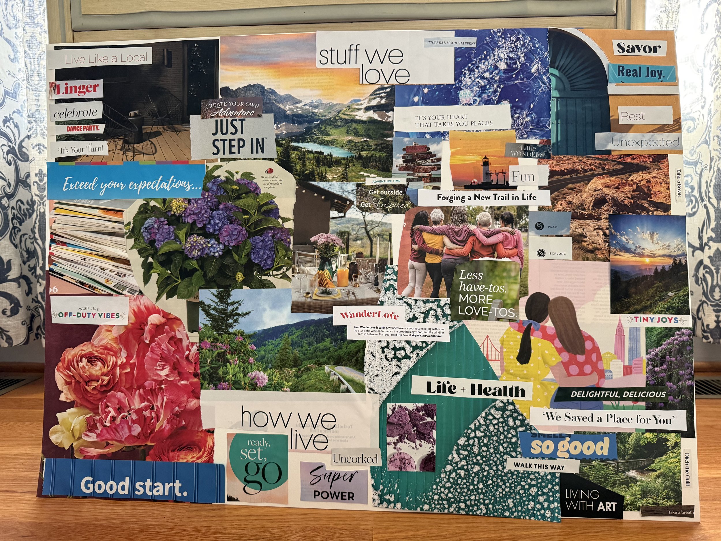 I read a quote recently that in order to move forward, it’s necessary to grieve the losses. And so, with a mix of curiosity and fear, I’ve stepped into a season of grieving my childhood. Not for the purpose of camping out there or even dig up old wounds, but in order to fully heal from the trauma I experienced. I’m not sure exactly what that looks like but I’m showing up, asking questions, wrestling with God, and practicing lament. Today, I participated in an activity for those grieving a loss. I didn’t set out with an agenda. I simply cut out images and words that appealed to me from a stack of magazines and glued them to a poster board. I’m still thinking about what emerged, but it was encouraging that I was looking forward. And some really good things made their way to the page. That gives me hope.