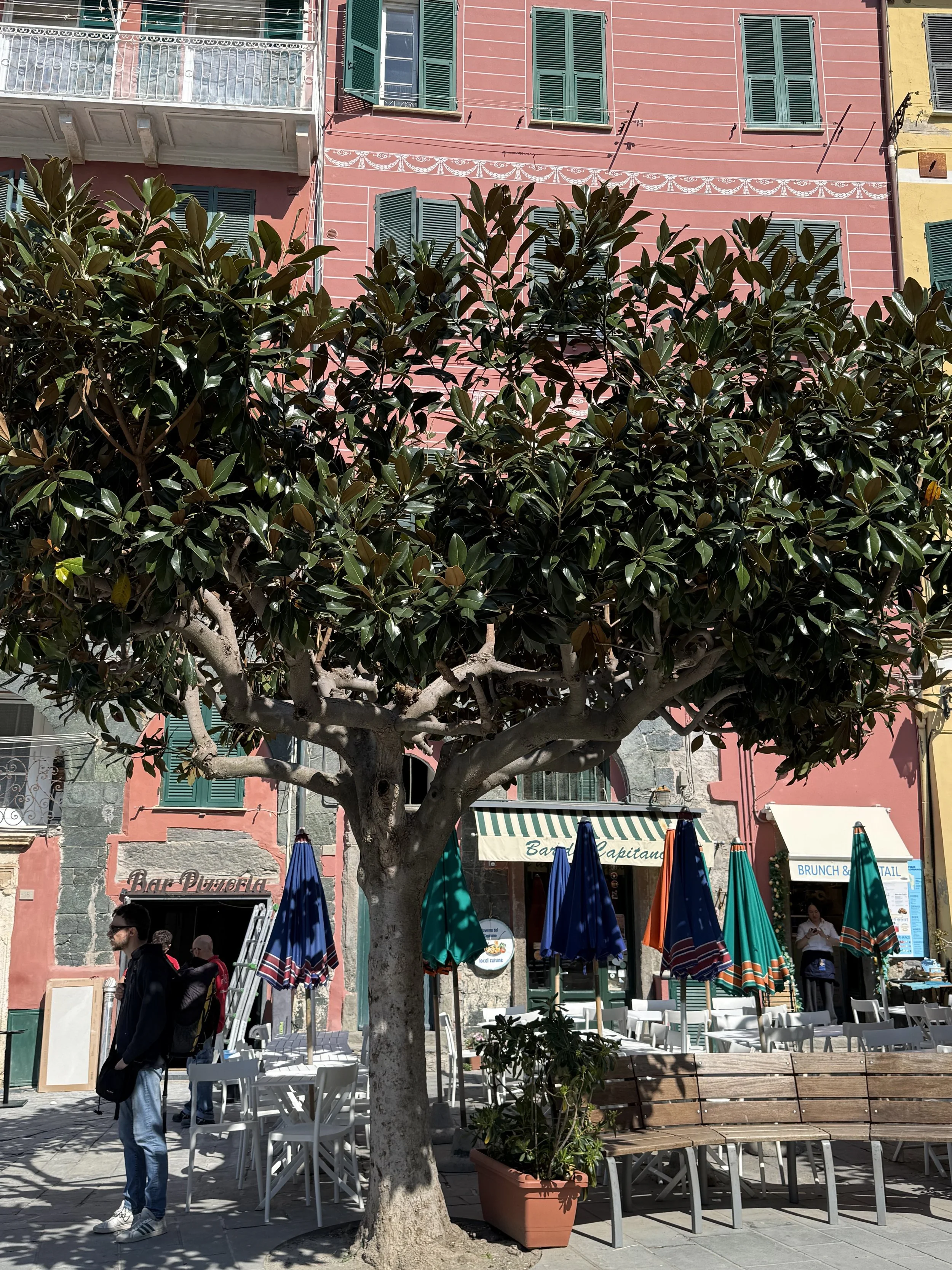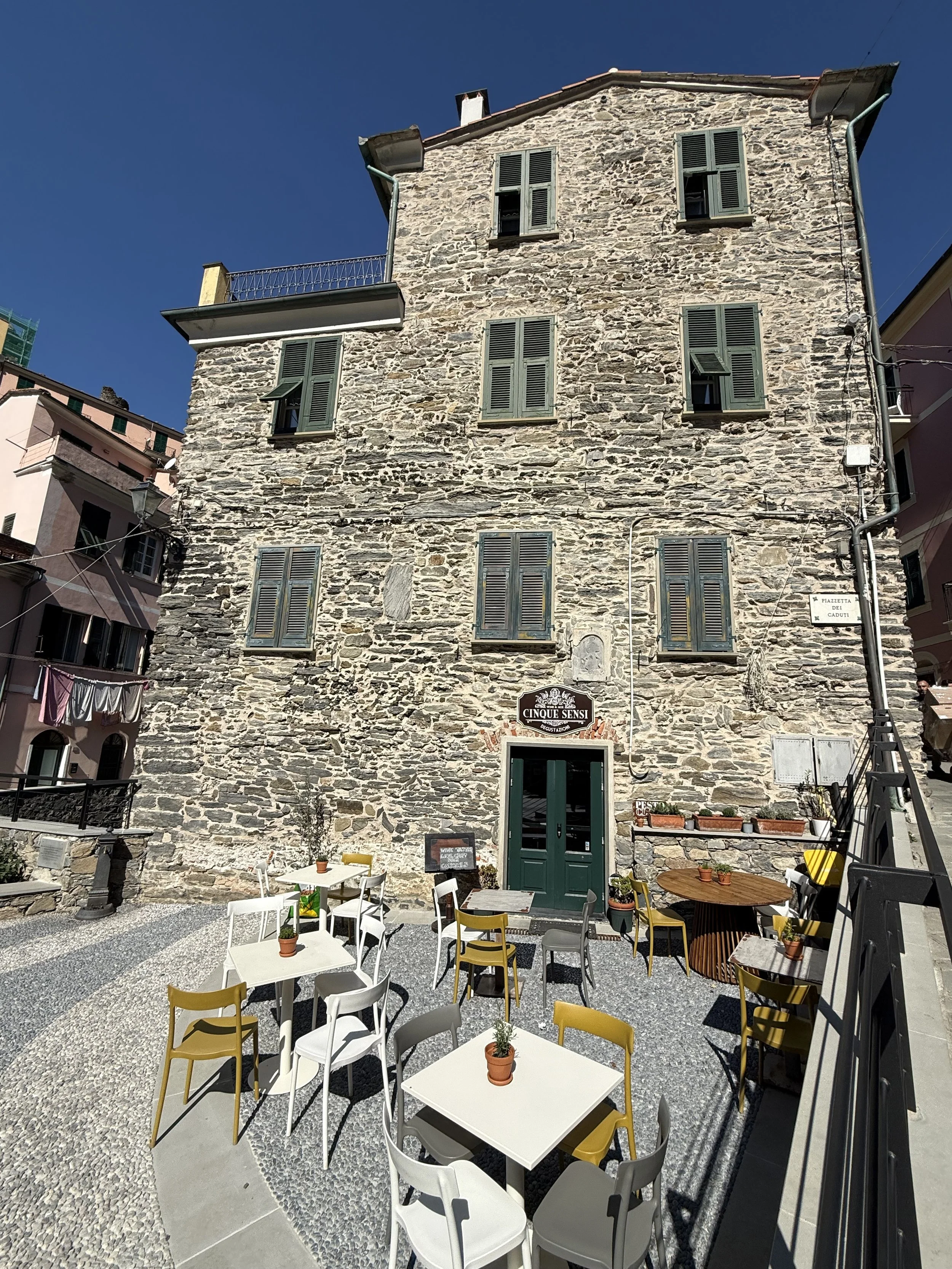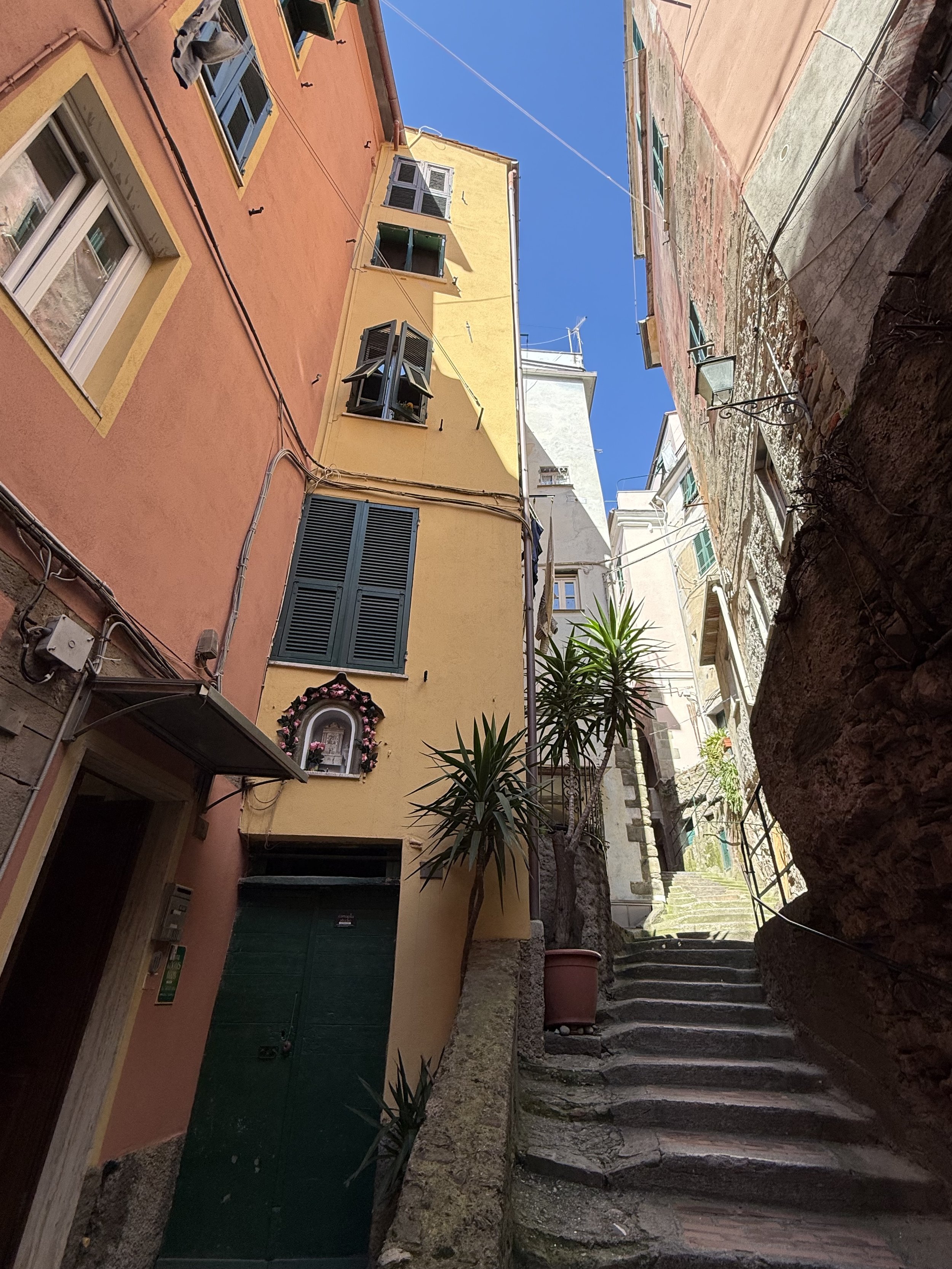 Sometimes called the pearl of Cinque Terre, Vernazza is full of charm. It was market day in Vernazza today so lots of fresh fruits, vegetables and other market items. There were also massive amounts of paper goods, as in, toilet paper and paper towels. It looked like Costco. Perhaps the town get paper products brought in once a month. I’m not sure and I didn’t ask. My adventure was seeking meds for Scott at the pharmacy. I to trust the pharmacist as he sold me the European equivalent of Tylenol. Scott is feeling better so I guess it’s all good.